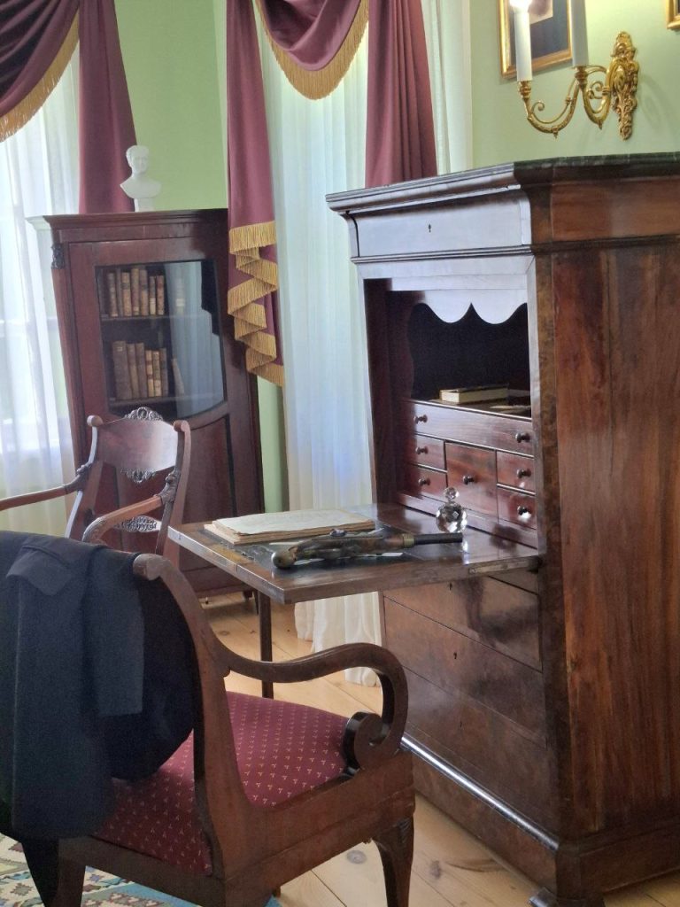 Музей литературных героев «Повестей Белкина» – это уникальное место, где дух старины органично сочетается с современными технологиями, позволяя посетителям максимально погрузиться в мир пушкинских произведений. Первое, что бросается в глаза при входе в господский дом, – это большой мультимедийный стол с сенсорным экраном, где собрана вся информация о Львовке и усадьбе. Этот островок современности не только не нарушает атмосферу прошлого, но и, наоборот, дополняет её, предлагая новые возможности для знакомства с историей. На первом этаже усадьбы, словно драгоценность, представлено первое издание «Повестей Белкина», датированное 1831 годом. Здесь же, в тщательно воссозданном кабинете вымышленного автора повестей, Ивана Петровича Белкина, посетители могут представить, как создавались эти бессмертные произведения. В обстановке кабинета человека, «ведшего жизнь самую умеренную, избегавшего всякого рода излишеств», – большие напольные часы, диван из болдинского барского дома Пушкиных и овальный стол, за которым автор мог уединяться для написания своих произведений. Сундук и корзины напоминают о хозяйственных заботах, которые, впрочем, не слишком занимали Белкина, предпочитавшего литературное творчество. Крутая деревянная лестница, покрытая лаком, ведёт на второй этаж господского дома, где расположена новая экспозиция, посвящённая повести «Станционный смотритель». Вся мебель выполнена из изысканной карельской березы, а на сенсорном экране можно увидеть фрагменты самого произведения, позволяющие лучше прочувствовать трагедию Самсона Вырина. Самая светлая комната музея отведена под экспозицию повести «Барышня-крестьянка». Здесь представлены небольшой диван, туалетный столик с зеркалом, а также костюмы барышни и крестьянки, отражающие двойственность главной героини. В такой сельской усадьбе когда-то мечтал жить со своей семьей сам Александр Пушкин. Его мечтам не суждено было сбыться, но пожить в подобных местах удалось героям его произведений. Именно в такую усадьбу переносится действие повестей «Выстрел» и «Метель». В комнатах бережно воссозданы различные мелочи, которыми могли пользоваться герои: подушечка для чтения книг, любовные письма, модные картинки из журналов XIX века, позволяющие почувствовать дух времени. В кабинете героя повести «Выстрел» символическое значение имеет не мебель, а картина над камином, хранящая следы роковой дуэли – отверстия от двух пуль, выпущенных графом и его таинственным соперником Сильвио. В спальне героини повести «Метель» царит звенящая тишина и строгий порядок. Все вещи на месте, кровать застелена, а Марья Гавриловна, томясь в ожидании, вышивает крестом дорожку, оставив работу незавершённой. Собран дорожный сундучок, приготовлен коврик из лебяжьего пуха – скоро с ней произойдёт невероятная романтическая история.
