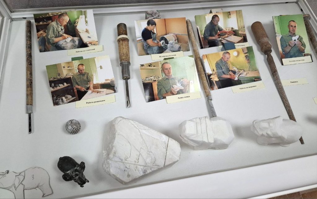 В Бутурлинском историко-краеведческом музее, где хранится множество работ Ивана Викторовича, главный хранитель фонда Ирина Владимировна Одинцова с гордостью рассказывает о творческом пути мастера и уникальности его творений. Каждое изделие начинается с эскиза: сначала мастер рисует задуманную фигуру, а затем лепит объёмную модель из скульптурного пластилина. Это позволяет увидеть будущий образ в объёме. Следующий этап – выбор камня. И здесь проявляется особое чутьё мастера. Если это слон – камень должен быть белым, если лиса – рыжим, а для снегиря нужен красный. Настоящий мастер никогда не покрасит камень, нужно работать с тем, что есть. Затем рисунок переносится на камень, и начинается самое главное – отсечение всего лишнего. Для этого используются как старинные инструменты – стамески и крашпили, так и современные электрические приспособления, которые облегчают тяжёлый труд. В последнее время Иван Викторович привозит камень с Урала, нанимая для этого большие грузовики, что, конечно, обходится недёшево. При этом, по словам мастера, и там производство камнерезных изделий постепенно затухает – тяжёлый труд с камнем мало кто хочет брать на себя. Работы Ивана Викторовича Евстифеева – это не просто сувениры, это произведения искусства, получившие широкое признание. За одну из своих работ – бегемота с уточками на спине – он был удостоен золотой медали на выставке ВДНХ в Москве. Его скульптуры приобретают зарубежные музеи и коллекционеры. Работы мастера, хранящиеся в Бутурлинском музее, часто становятся центральной частью экскурсий. Дети с удовольствием приходят посмотреть на удивительный мир, созданный Евстифеевым. Вот, например, большой, страшный волк с зайцем – подарок от мастера – настолько реалистичен, что малыши порой спрашивают: «Он не кусается?» Сейчас Иван Викторович работает дома, так как фабрика, где он был главным художником, закрылась. Однако мастер ушёл с фабрики до её закрытия из-за разногласий с руководством: начальство было нацелено на производство массовой продукции, сувениров; в то время как Иван Викторович стремился к высокому искусству. В Борнукове, где живёт художник-анималист, есть Музей камня. Там и в доме Евстифеева хранятся полноразмерные скульптуры, которые перевезти довольно сложно. Ирина Владимировна Одинцова подчёркивает, что работы мастера красивы, но довольно хрупки: ангидрит – мягкий камень и при сильном ударе может разлететься на тысячу частей. Поэтому их перевозка требует особой осторожности. И Бутурлинский историко-краеведческий музей, где представлены как приобретённые, так и подаренные Иваном Викторовичем работы, бережно хранит это уникальное наследие, позволяя каждому прикоснуться к истории борнуковской резьбы.